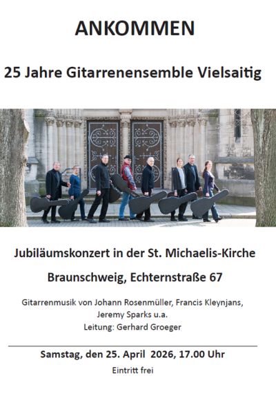 Zu einem Jubläumskonzert lädt das Gitarrenensemble "Vielsaitig" unter Leitung von Gerhard Groeger in die Michaeliskirche (Echternstr. 67) Es erklingt Musik von Johann Rosenmüller, Francis Kleynjans, Jeremy Sparks u.a.